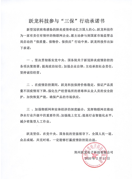 新型冠状病毒感染的肺炎疫情牵动亿万国人的心,jrs直播科技作为一家有责任有情怀的物联网企业,愿主动参与到国家市场监管总局启动的“保质量、保物价、保供应“行动中来,jrs直播科技作出如下承诺: