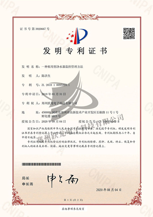 近日,从国家专利局传来喜讯,由公司自主研发设计的“一种租用型净水器监控管理方法”喜获国家知识产权局发明专利授权(专利号:ZL 2018 1 0095323.1)。