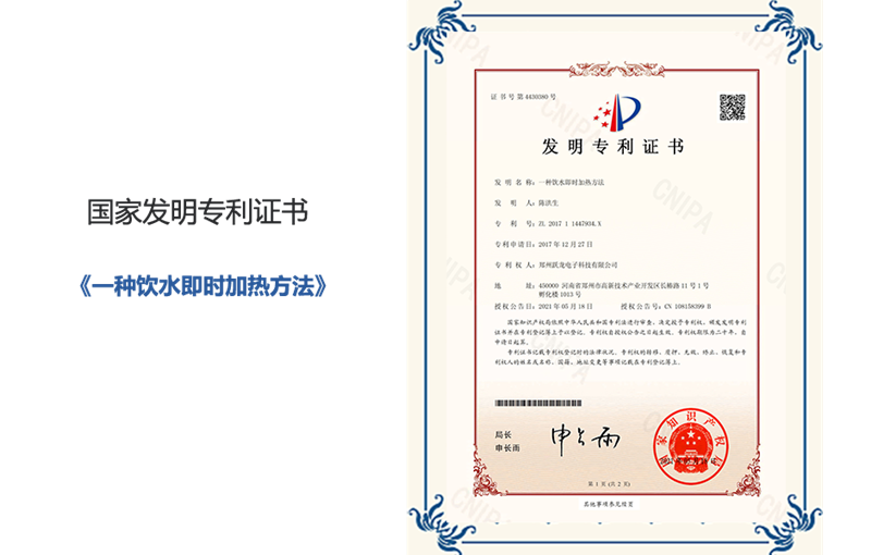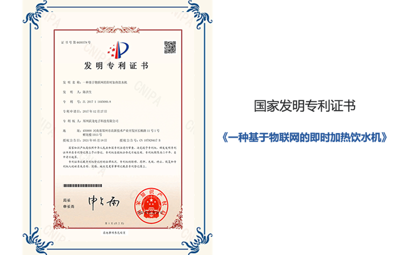 近日,jrs直播科技申报的《一种基于物联网的即时加热饮水机》和《一种饮水即时加热方法》被国家知识产权局授予“发明专利权”,有效期二十年。该发明专利可以实现对饮用水的即时加热,并且可对出水温度、出水水量进行精确控制,对水质进行检测,通过物联网能够传输用水信息,提醒及时供水,方便人们用水需求,具有安全、节能和智能化的特点。