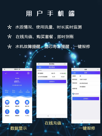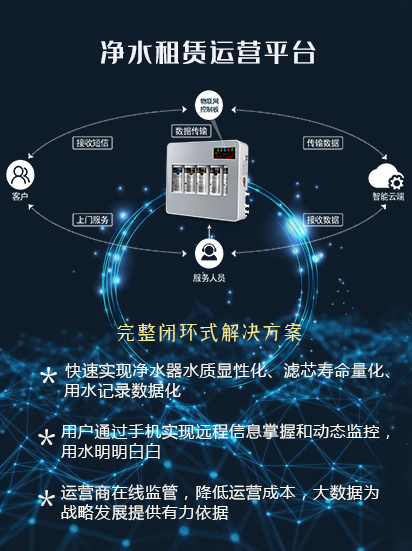 无论您的净水方向是租赁还是共享业务,不管您的运营模式是加盟分销还是社交分销,也不论是扫码支付还是储值卡扣费,我们都提供一套完整的体系来支撑您。
