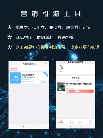 同时,本着帮助企业运营的目标,我们不断开发丰富的引流裂变工具:优惠券、礼品卡、积分商城、拼团、支付有礼、销售返利…,只要是对运营有所帮助,都是我们研发的方向。