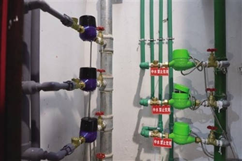 如下图中的小区,预先设置了双管双水表。灰色的是自来水水管,连接着蓝色(黑盖)的自来水水表;绿色的是中水水管,连接着绿色的中水水表,标有“中水禁止饮用”字样。